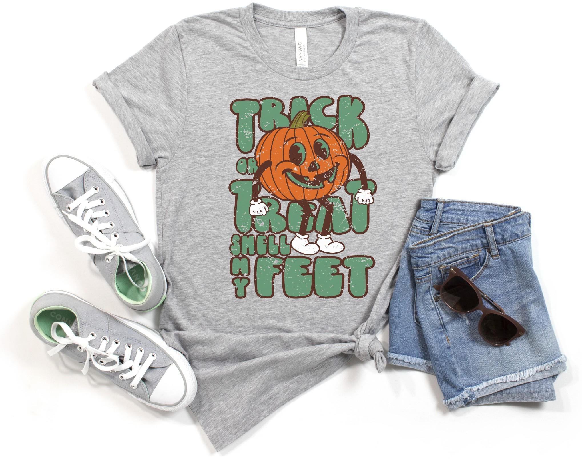 Super soft and comfy Athletic Heather "TRICK OR TREAT Smell My Feet" tee. Funny and cute tee. Soft tee with screen print ink for a comfy feel and look.